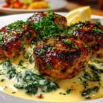 These baked chicken ricotta meatballs are tender and flavorful, perfectly complemented by a rich and creamy spinach Alfredo sauce for a comforting Italian-inspired meal.