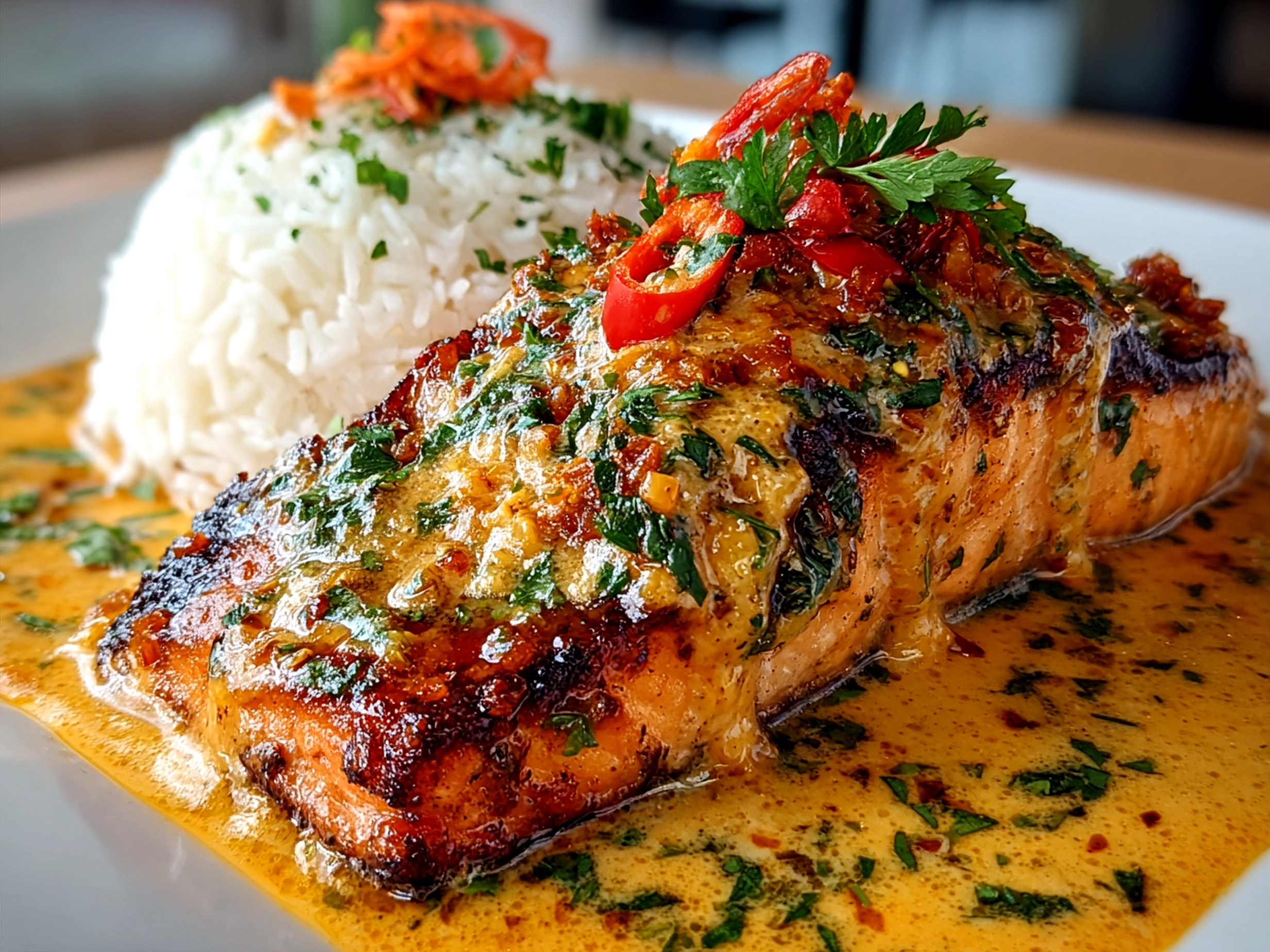 - Plate up: When salmon is done, transfer to serving plates. Spoon the Bang Bang sauce generously over each fillet. Garnish with scallions, sesame seeds, and a lime wedge for that bright pop.