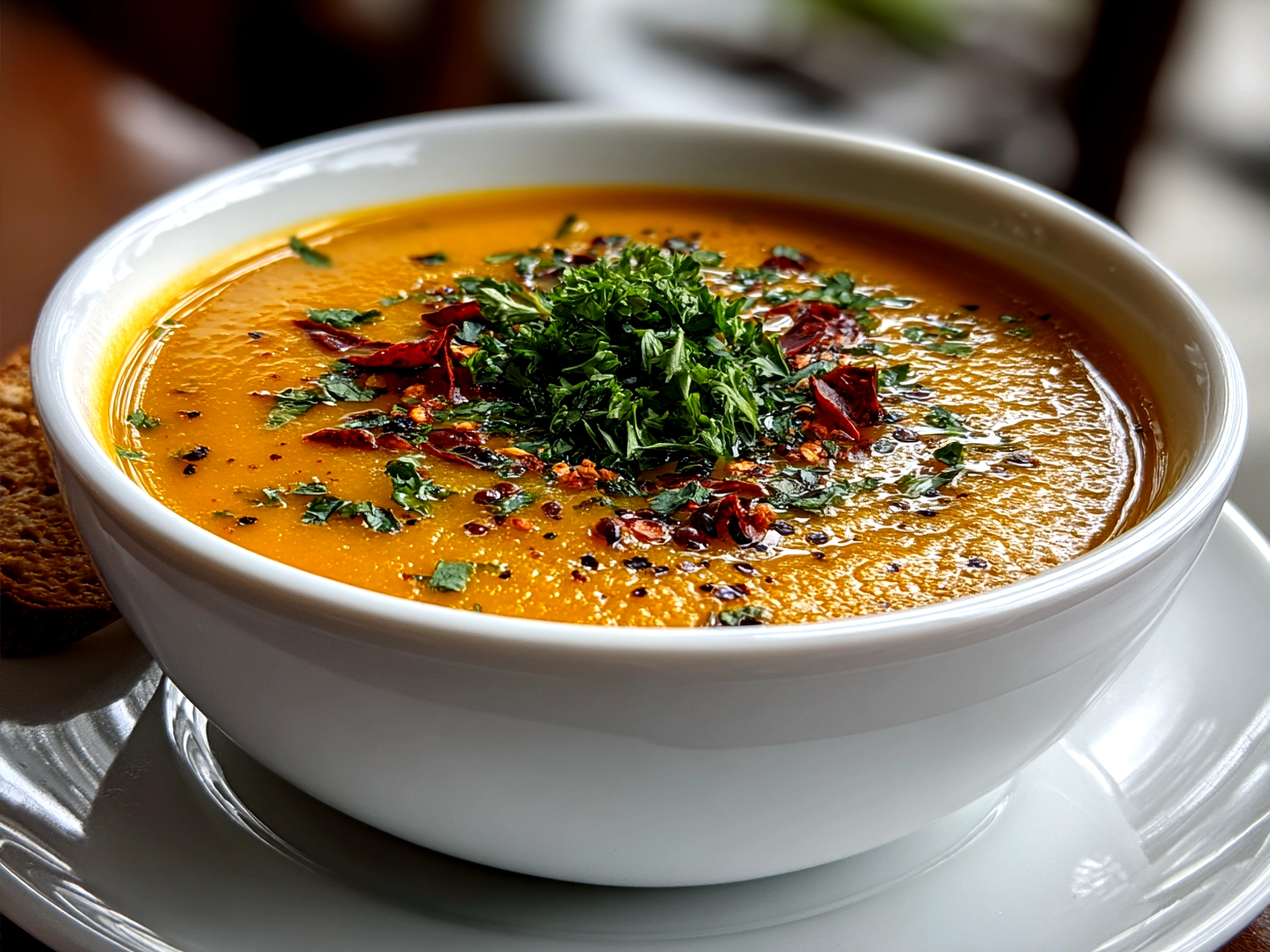Bowl of creamy Carrot and Lentil Soup garnished with fresh herbs