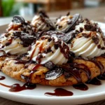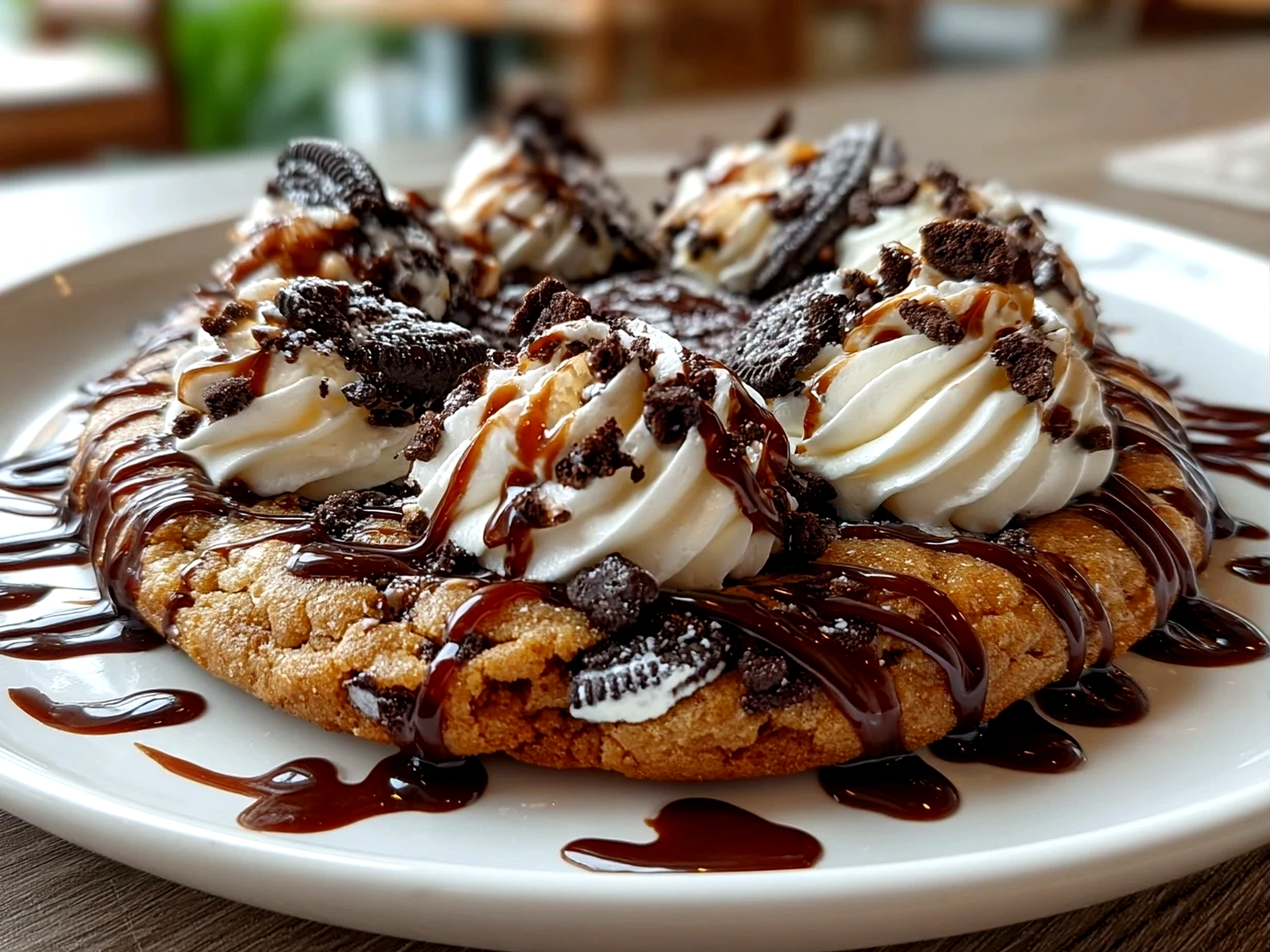 This Cookies Cream Skillet Cookie features a warm, gooey cookie loaded with chunks of cookies and cream, perfect for sharing straight from the skillet.