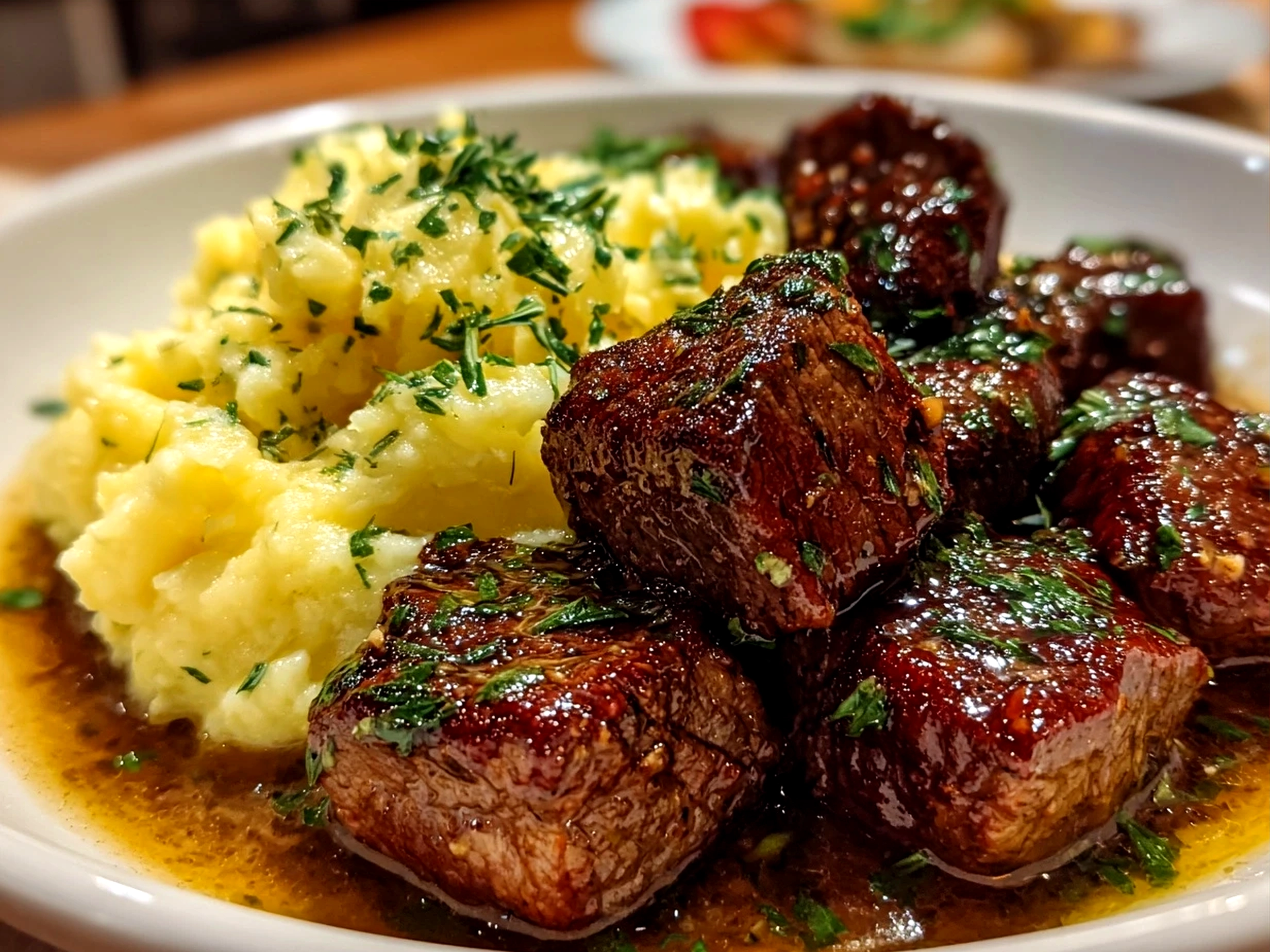 - Serve beef bites over or alongside the creamy mashed potatoes, garnished with fresh parsley.