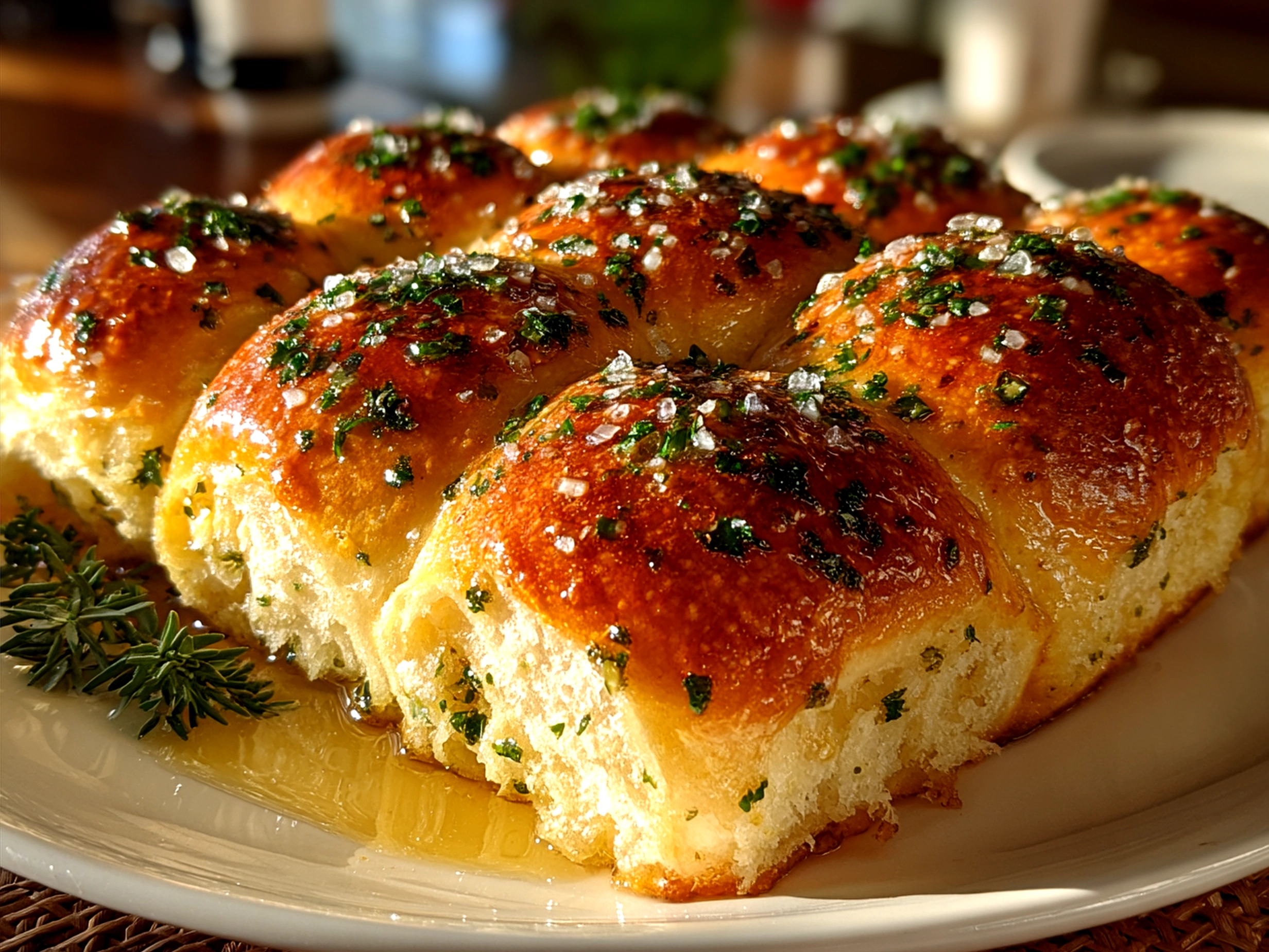 Soft, fluffy dinner rolls brushed with rich garlic butter, perfect for complementing any meal or enjoying on their own.