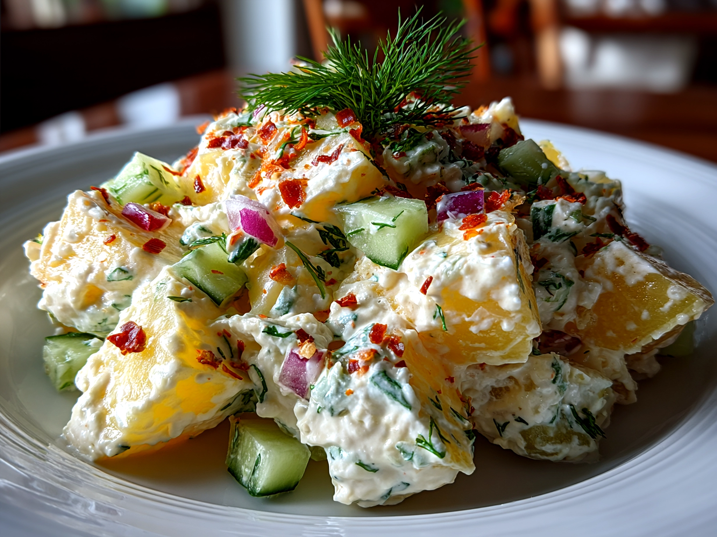 A creamy and refreshing potato salad made with Greek yogurt and crisp cucumbers, perfect for a healthy and flavorful side dish.