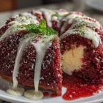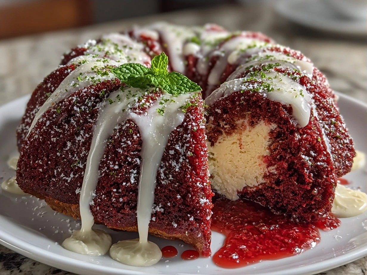 A moist and rich red velvet bundt cake layered with tangy cream cheese frosting, perfect for celebrations and dessert lovers.