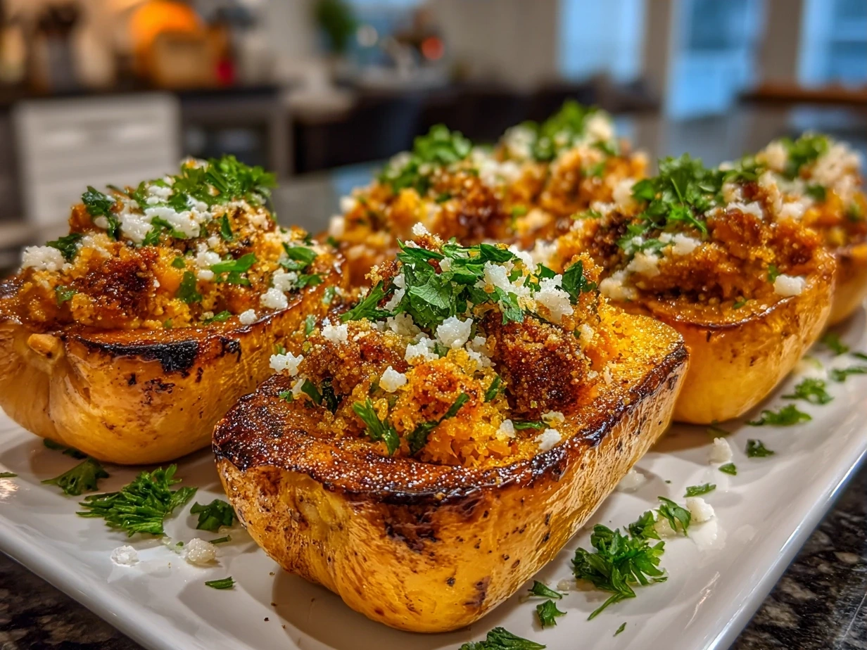 Finished Simanim Stuffed Butternut Squash dish garnished and ready to serve