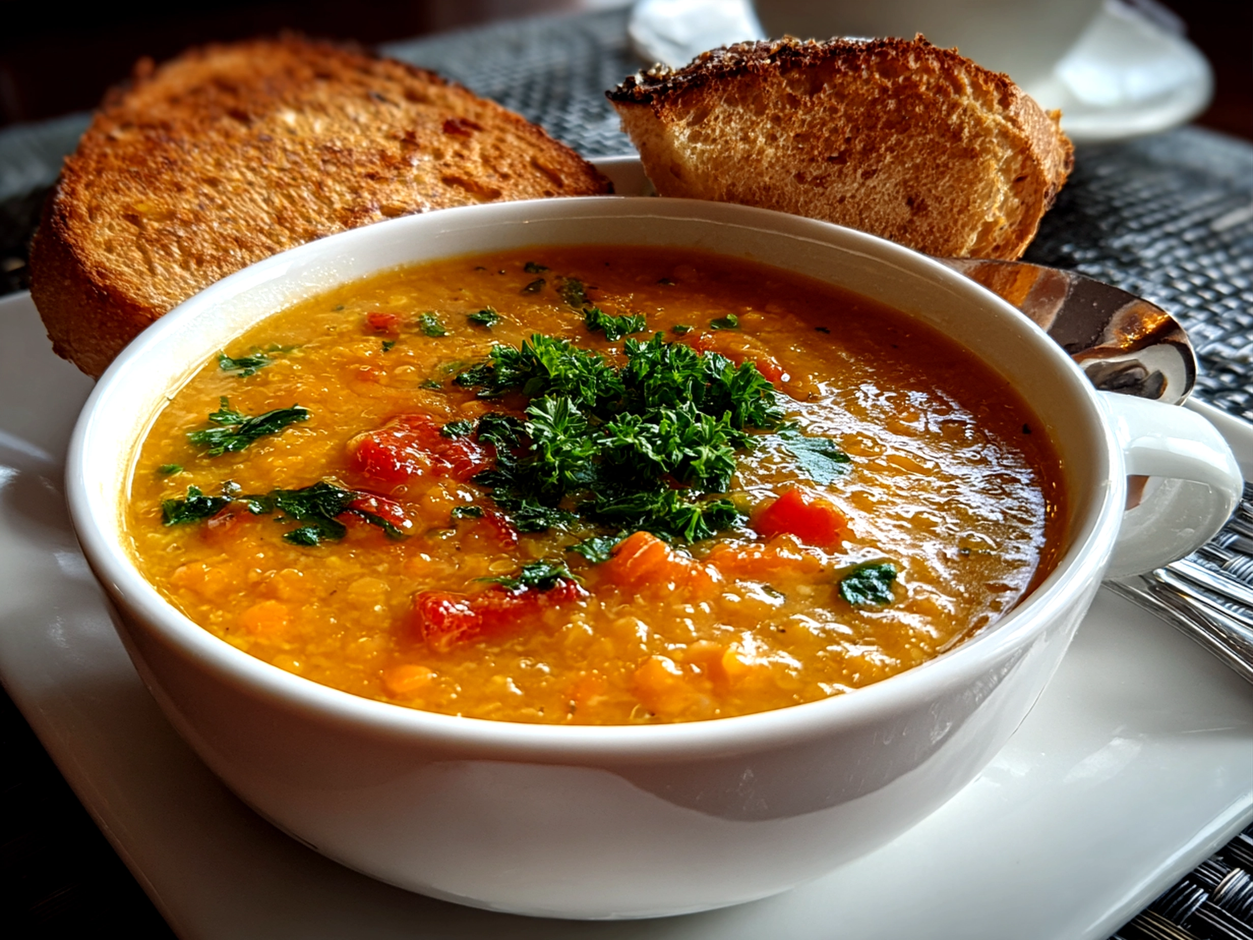 A flavorful and comforting Thai-inspired soup featuring creamy coconut milk and tender red lentils, infused with aromatic spices and fresh herbs.